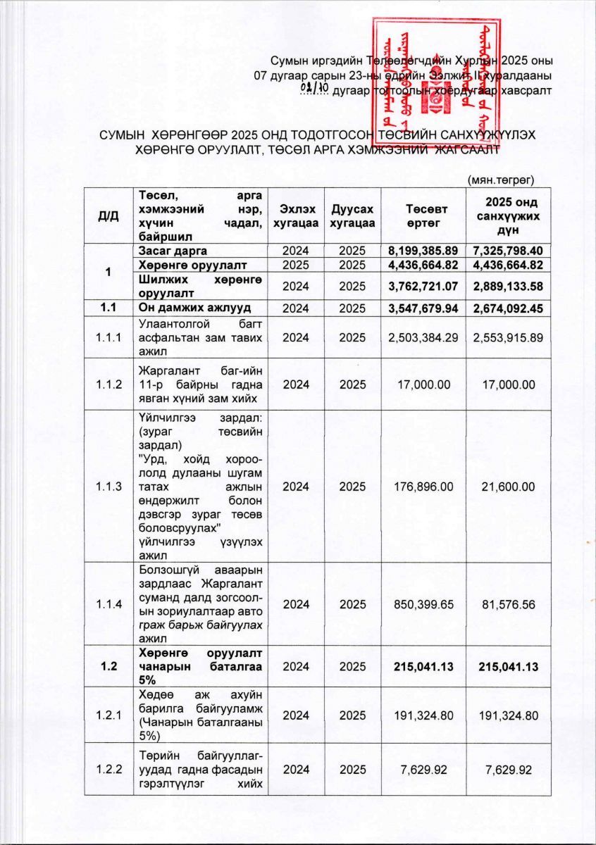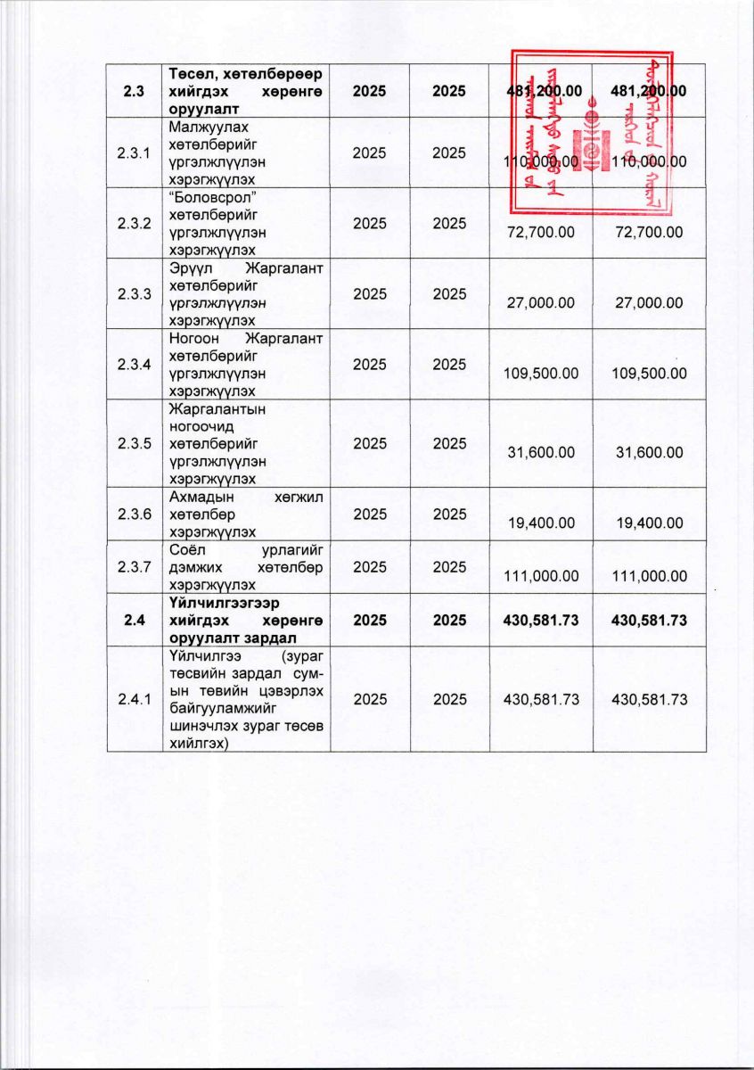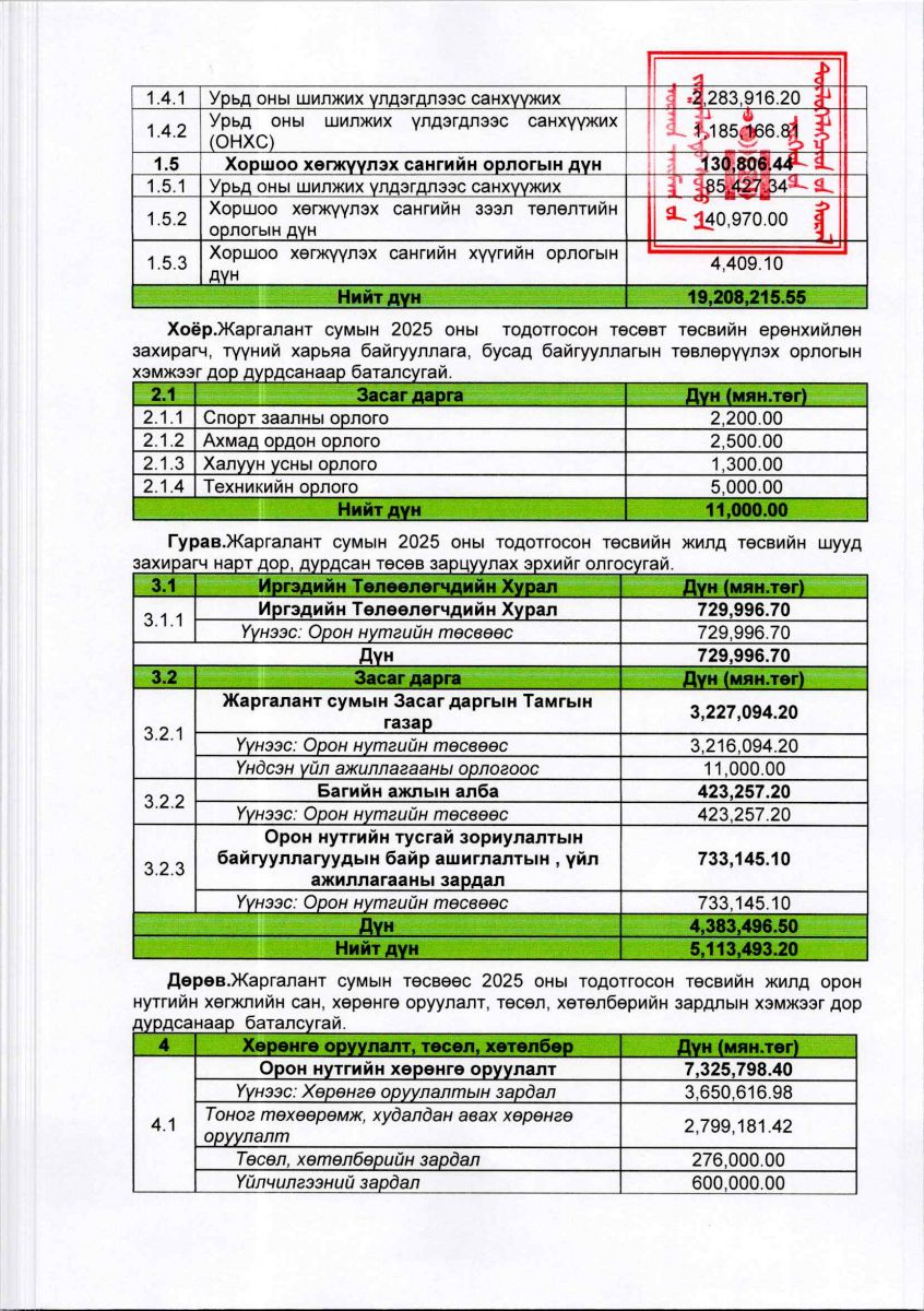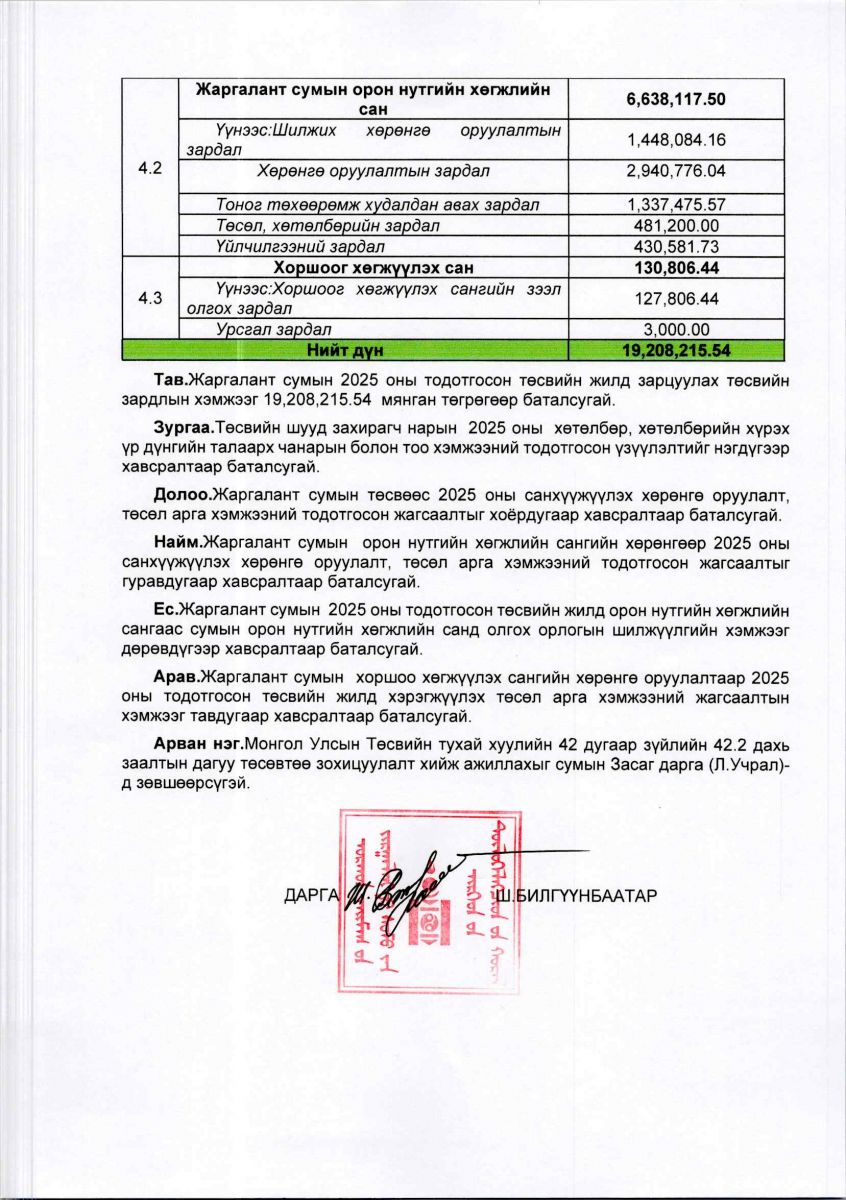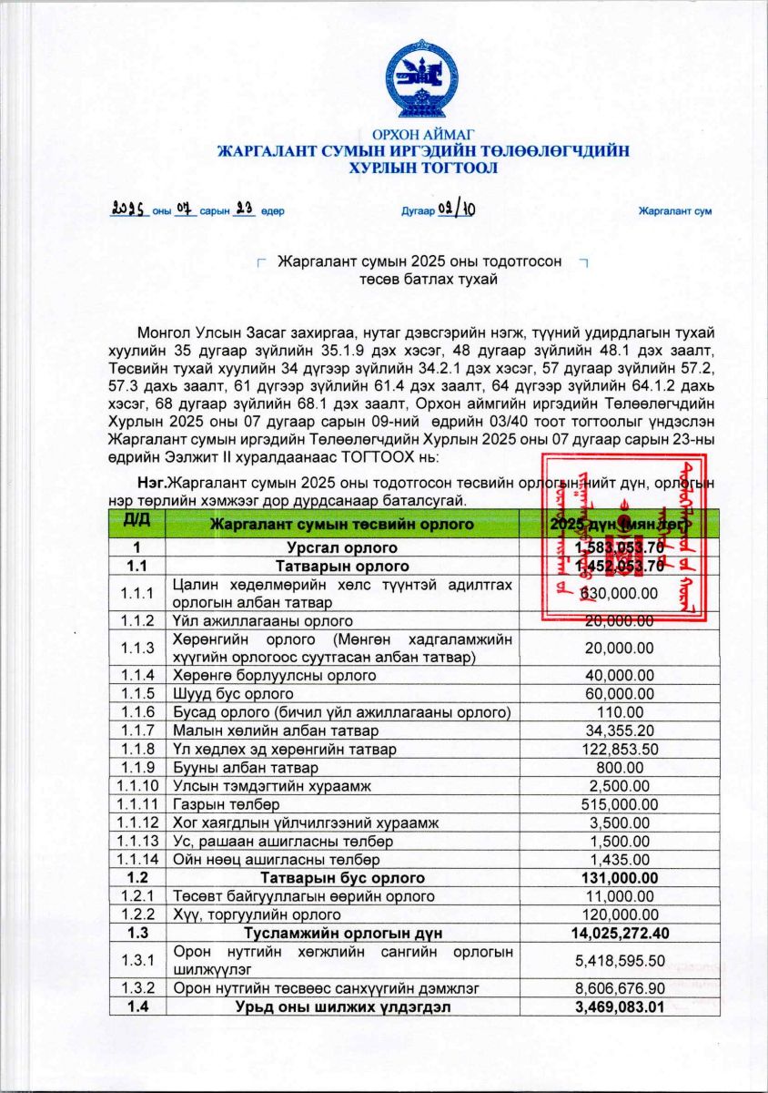Жаргалант сумын 2025 оны тодотгосон төсөв