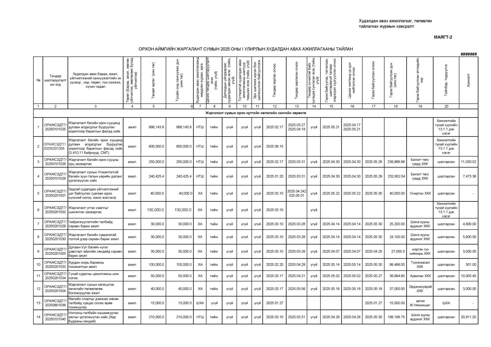 Жаргалант сумын 2025 оны Худалдан авах ажиллагааны 2 дугаар улирлын тайлан