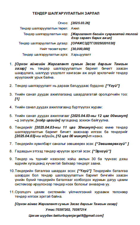 Тендерийн урилга